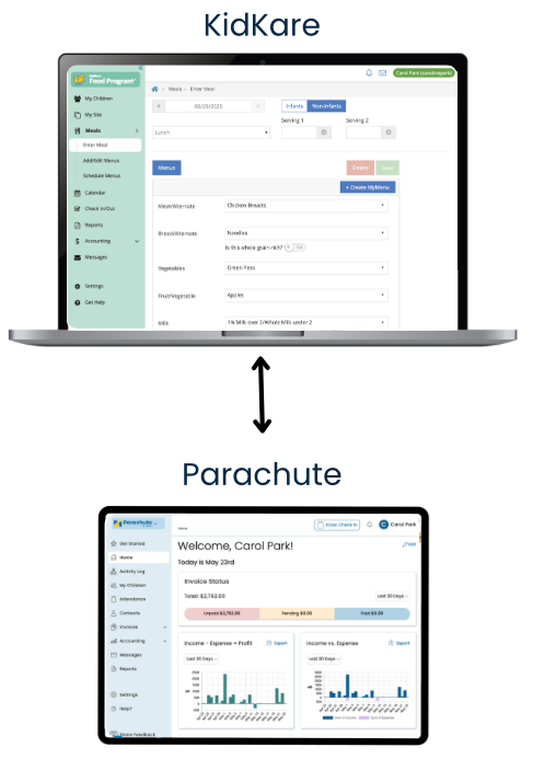 KidKare + Parachute is one connected flow for complete food program, finances, and childcare management.