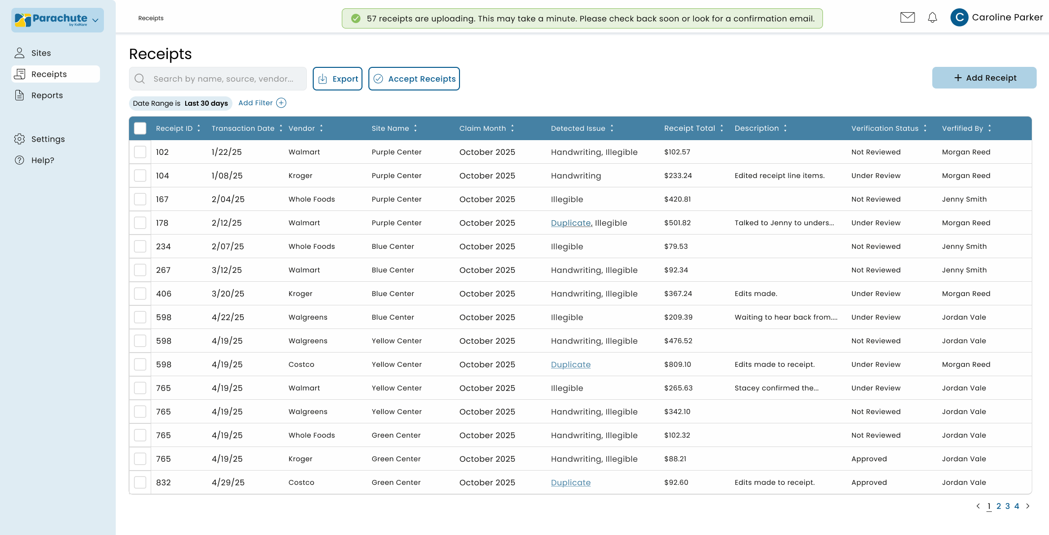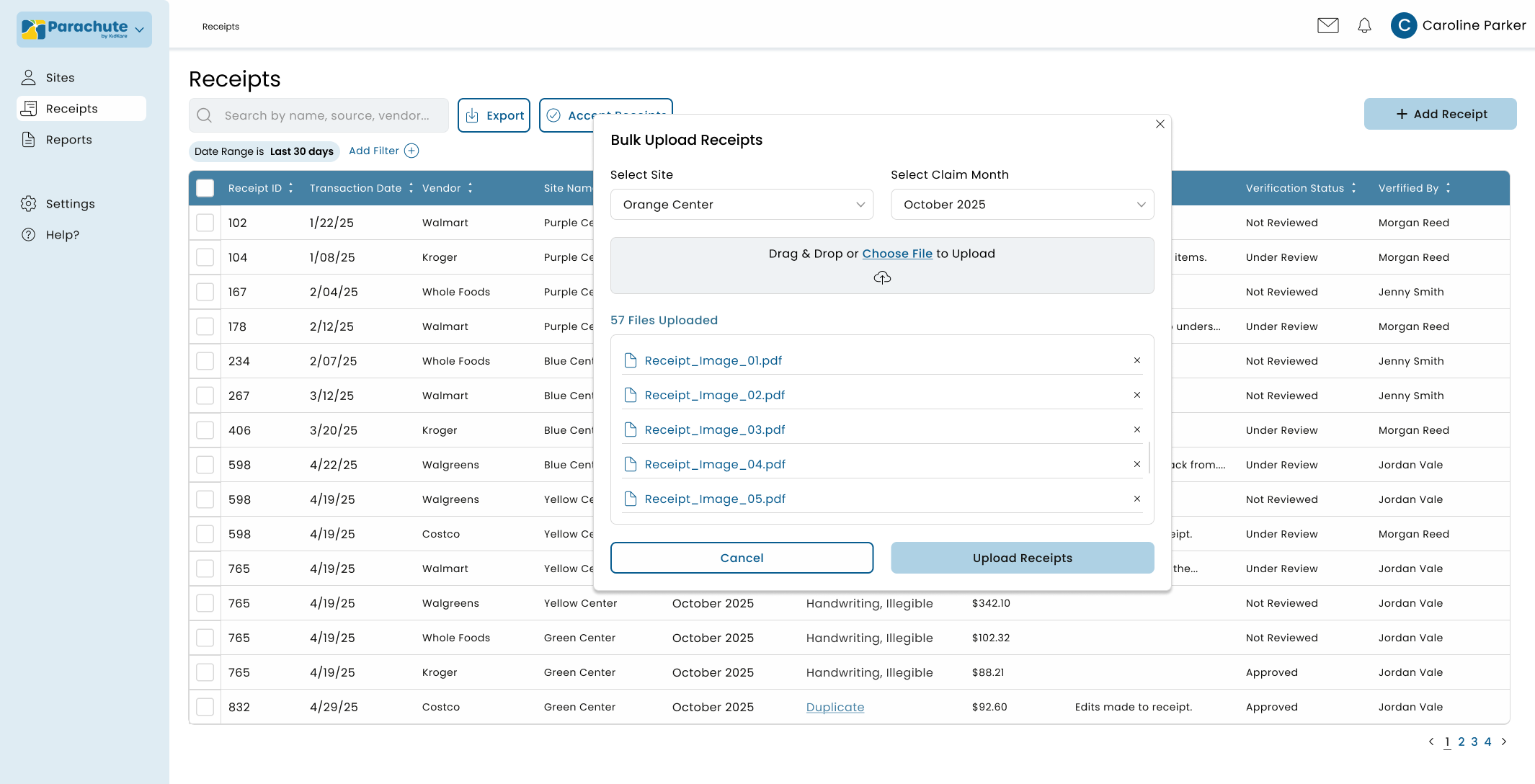 Upload receipt images directly into Parachute. Whether you receive 10 receipts or 100, the bulk scanner processes them simultaneously, converting physical documents into digital records without individual handling or sorting.