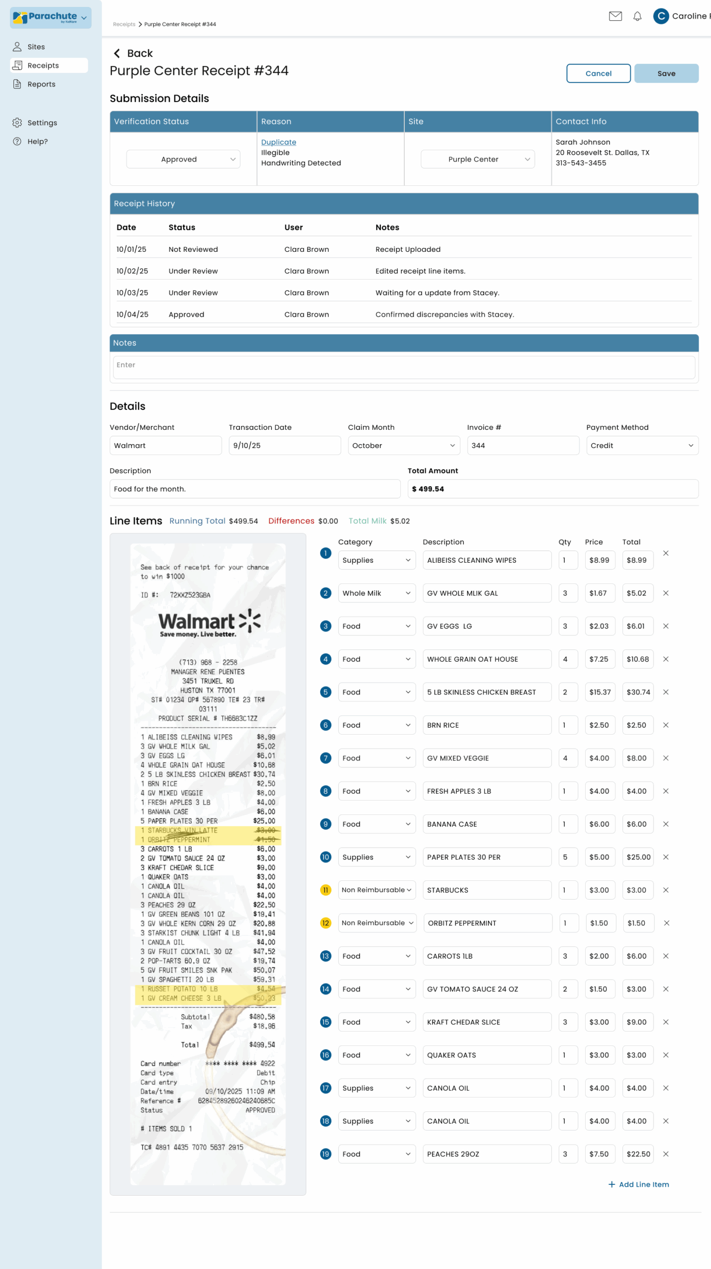 Parachute automatically reads each receipt, extracting critical information including dates, vendor names, amounts, and total amount. Claim month assignment ensures correct categorization. Plus, milk audit tracking updates milk balances automatically in Food Program side.