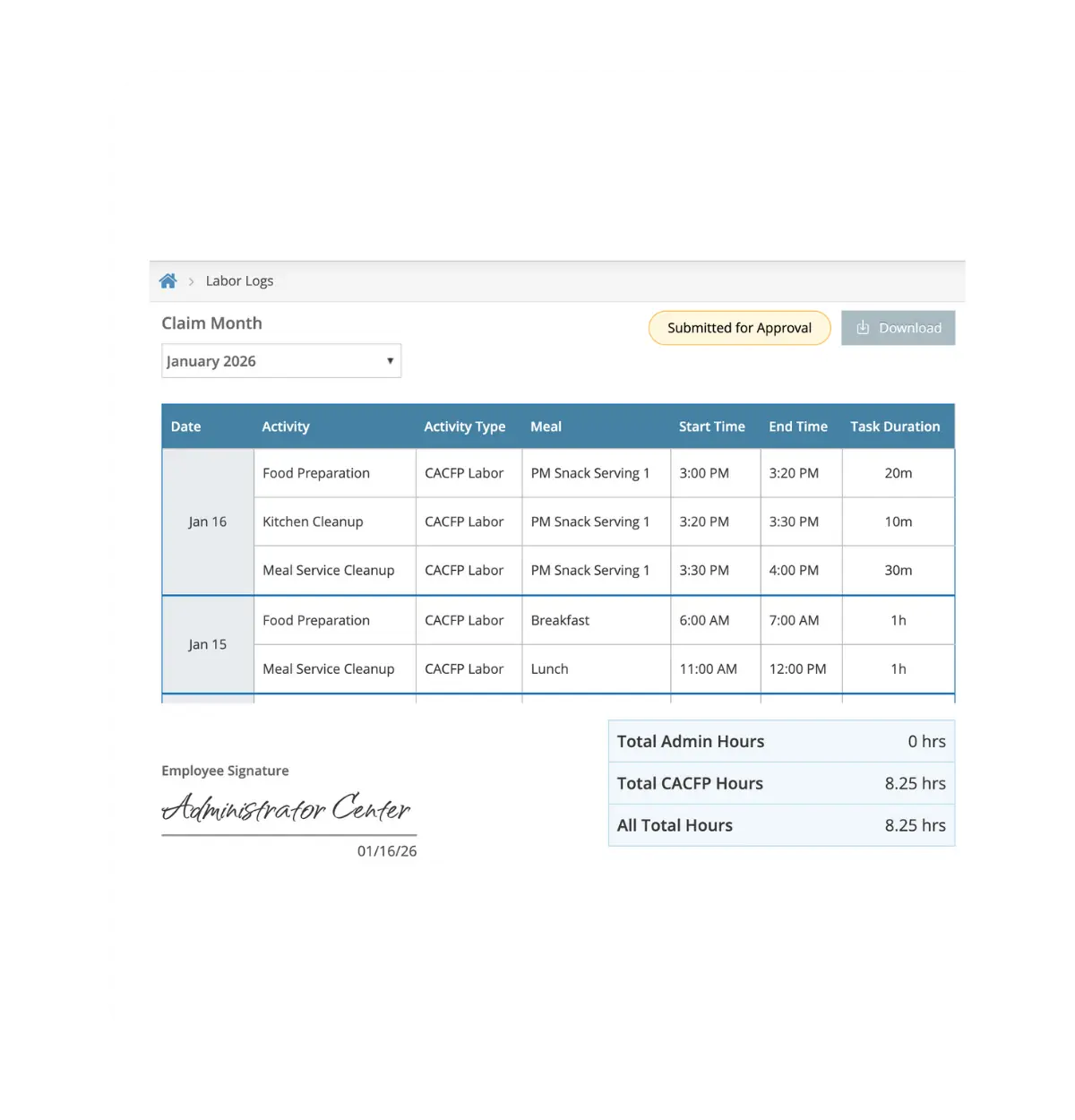 This isn’t another HR tool trying to do CACFP. Labor Log understands your world—daily tracking, monthly approvals, and claim-ready exports in one seamless workflow.